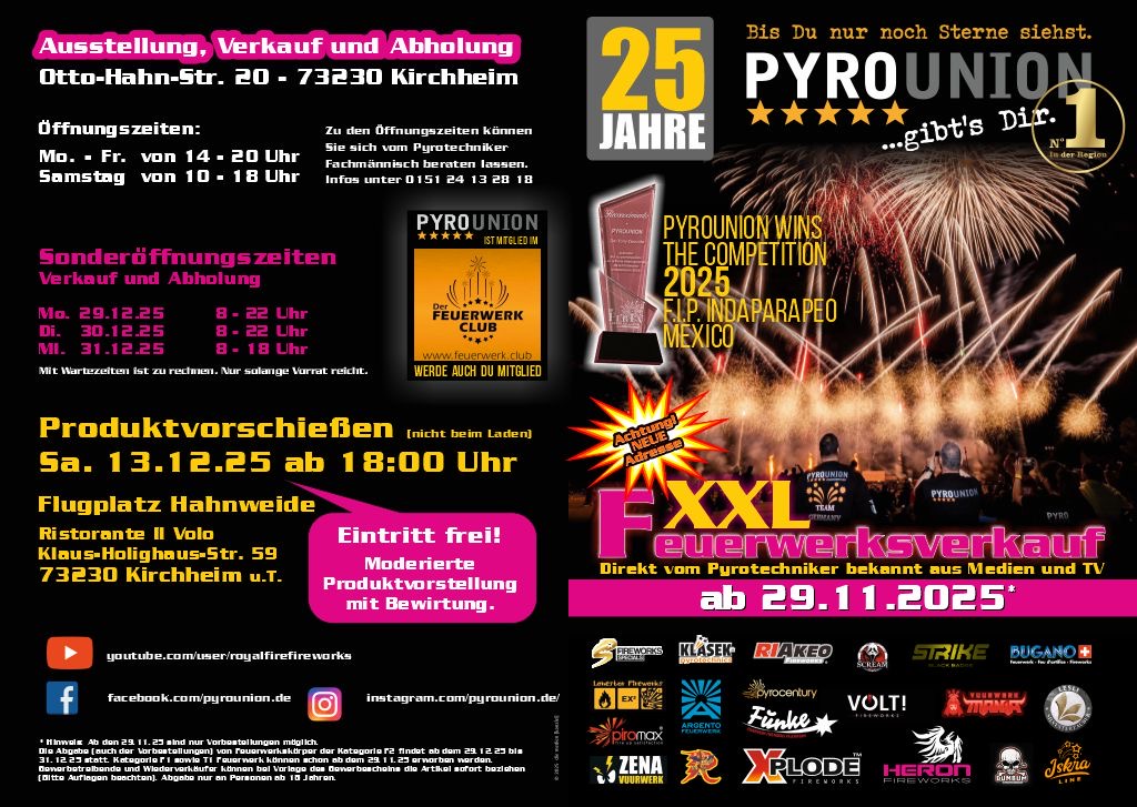 Besuchen Sie unseren Laden. Bestellen Sie Ihr Feuerwerk vorab und holen Sie es ab dem 29. Dezember ab, um Zeit zu sparen und sicherzustellen, dass Ihre Favoriten nicht ausverkauft sind. – Unsere erfahrenen Pyrotechniker stehen Ihnen für persönliche Beratung und Unterstützung bei Ihrem Silvesterfeuerwerk zur Verfügung.